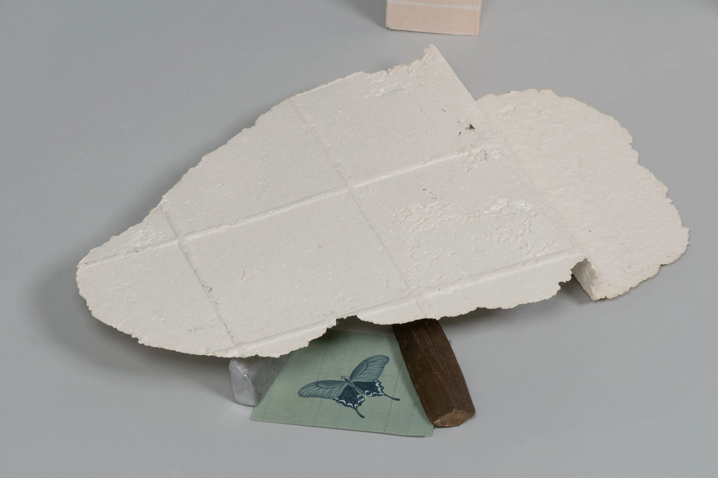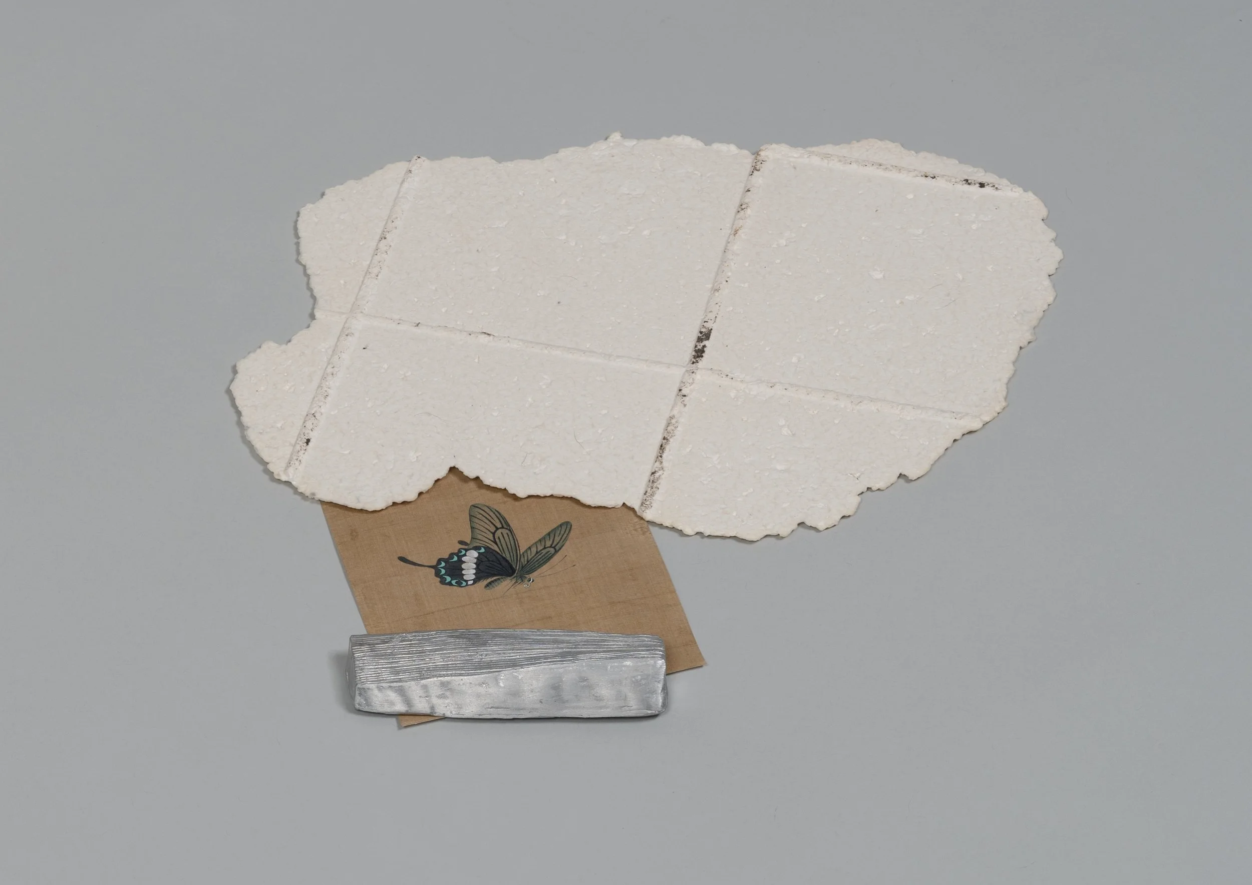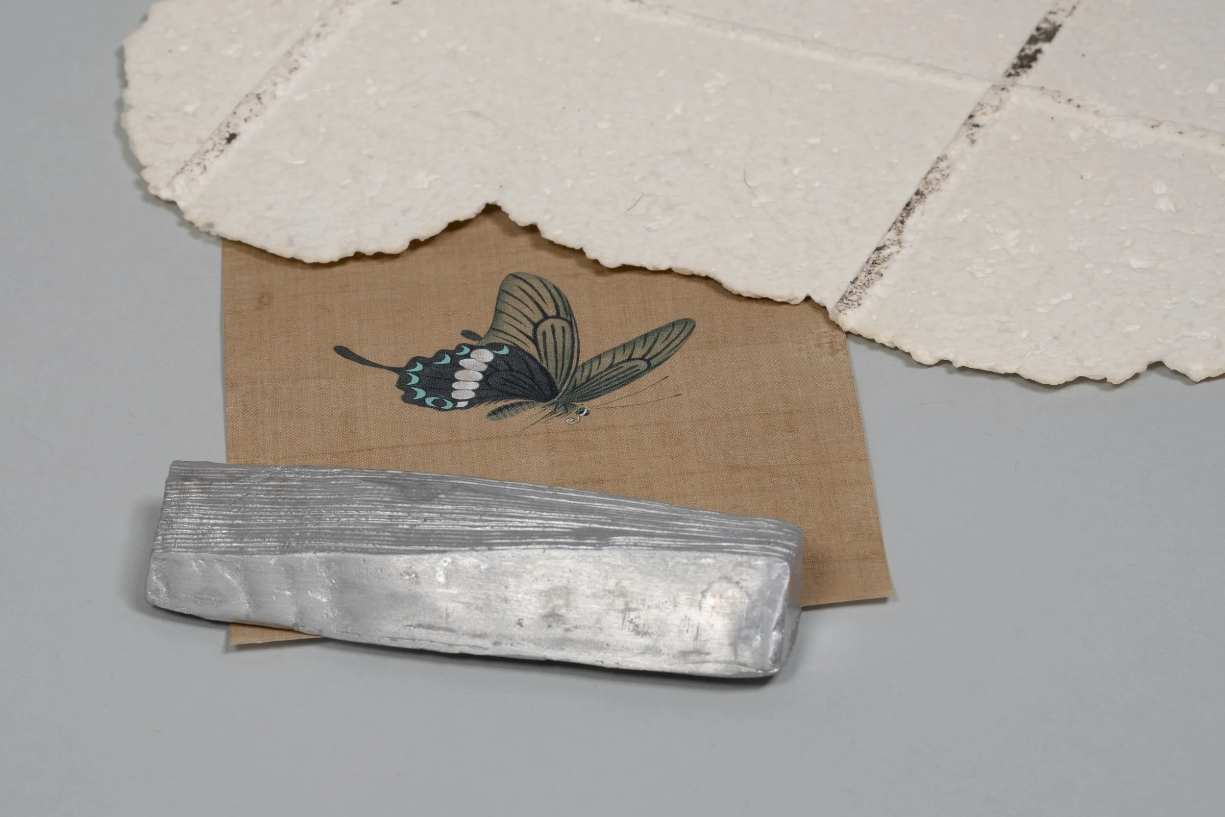 Aged silk, Chinese watercolor, ink, Xuan paper and pulp, copper, aluminum, aluminum screen mesh, wood, epoxy, avocado hydroponic sprout